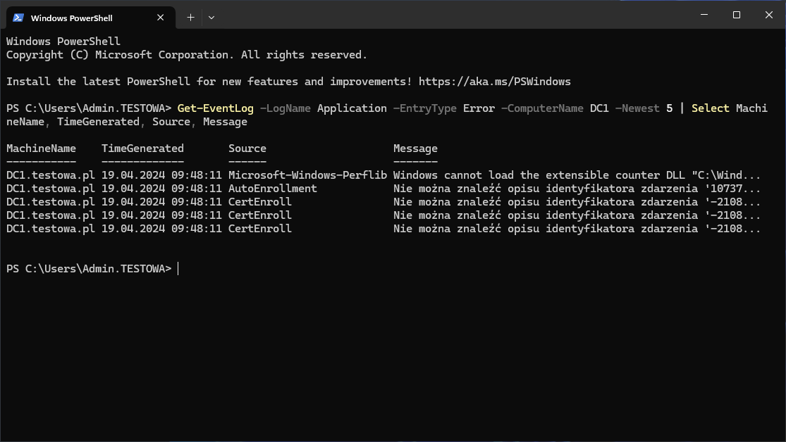 Jedną z zalet korzystania z PowerShella jest możliwość odpytania zdalanych maszyn o ich dzienniki zdarzeń (chociaż Event Viewer również daje taką możliwość). W kolejnym przykładzie przyjrzymy się właśnie takiemu scenariuszowi, a mówiąc dokładniej postaramy się wyświetlić 5 ostatnich błędów z dziennika Aplikacje na zdalnym serwerze.